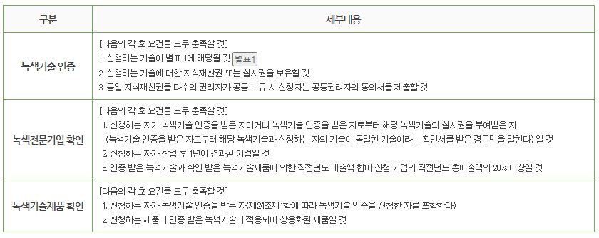 2) 신청요건: 녹색인증 구분에 따라 다음의 각 호 요건을 충족하여야 함