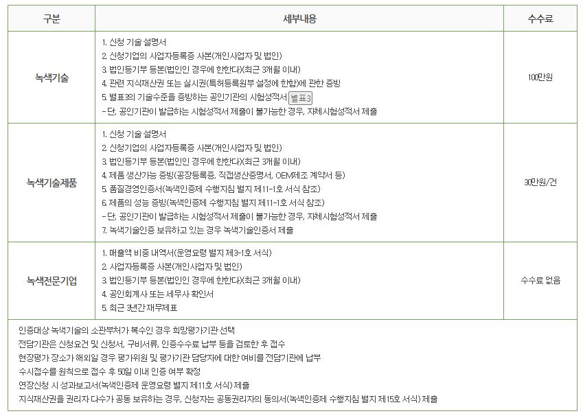 3) 신청서류: 녹색인증 구분에 따라 다음의 서류를 준비하여야 함
