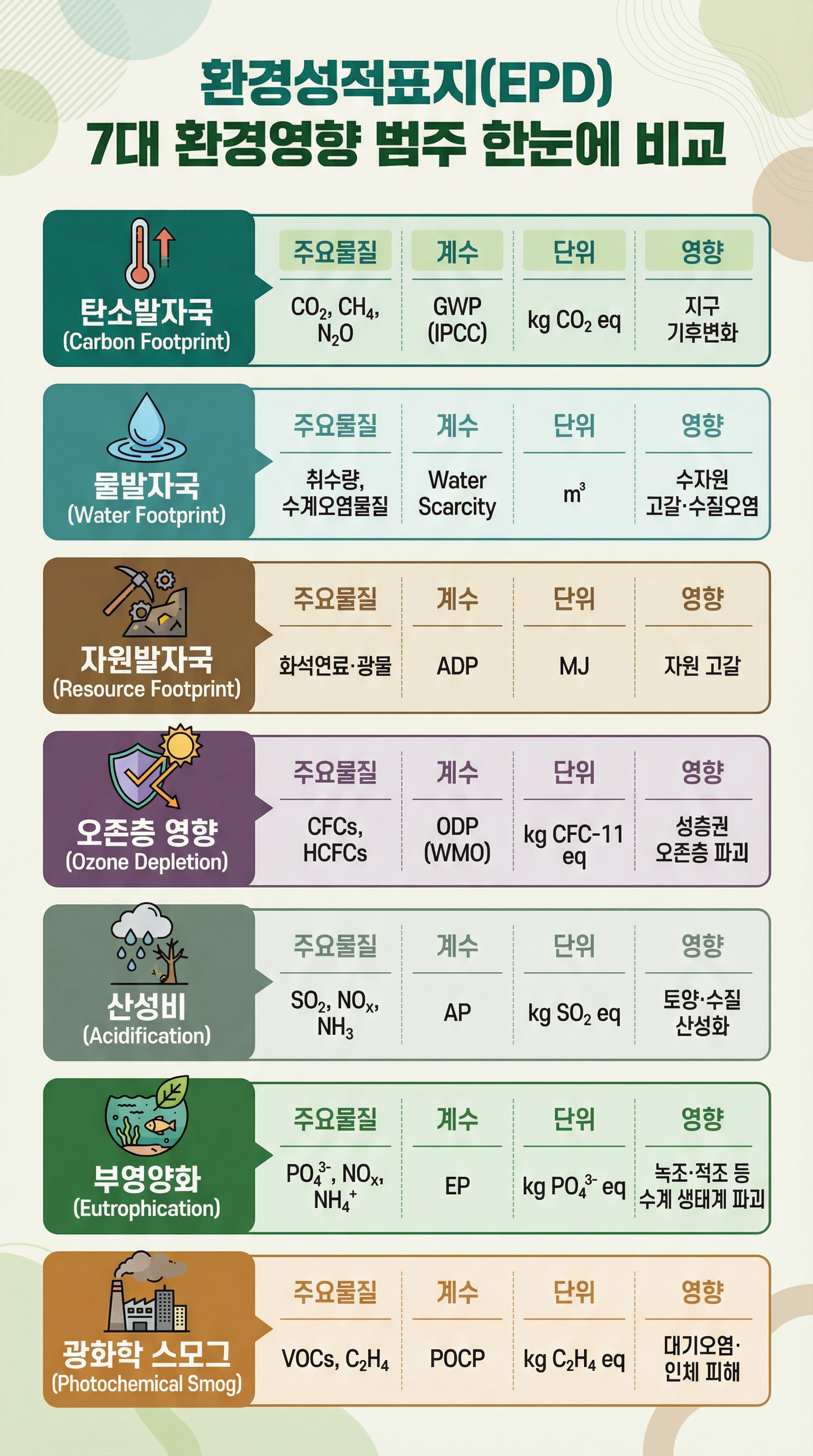 간략히 정리해 봅니다. 환경성적표지 영향범주와 인증값에 대해 이해하는데 도움이 되리라 생각합니다.